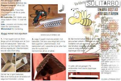 En miniholk är 280mm lång, 60mm hög och 40mm bred. Den är ganska enkel att bygga. Har plats för rör som är 6-11mm i yttertdiameter och 200mm långa. Du kan rulla egna rör till de minsta som en insats i 6mm rör. Solitärbo mini monteras med långsidan mot väggen och kortsidan mot öster eller sydost. År 1 så fylls rören med ägg och år 2, på våren i början av april, tar du ut rören ur dina biholkar och lägger dem under en stor blomkruka på en solig plats och låter den vara där hela sommaren. Bina flyger ut och hittar dina biholkar och du kan ta bort pappersrören i augusti. Har du snickerimaskiner så kan du bygga en insats till Solitärbo med hål som är ca 3mm stora och specialgjord för citronbin. Hålen görs som spår i en 2-delad insats. Spår efter klingan på justersågen kan räcka i storlek. |