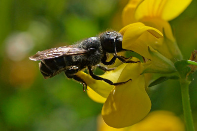 (Osmia caerulescens) Blåmurarbiet påträffas ofta i parker, trädgårdar i villaområden och kring gårdar på landsbygden. Boplatsen kan vara i diverse håligheter i solbelysta väggar, bihotell som har bamburör eller borrade hål med diametern 4-5 mm. I flyghål från vedlevande skalbaggar i döda trädstammar. Även i avbrutna stänglar av fläder, hallon och björnbär. Honan kan också återanvända tidigare bebodda håligheter som hon rensar från gammalt material. Yngelcellerna separerar hon med mellanväggar som består av tuggade blad och även mynningens yttervägg består av växtmaterial. Hanarna kläcks ett par veckor före honorna och har för det mesta fullbordat sin flygning i juni, honorna flyger in i augusti. Det finns uppgifter om att den kan samla pollen från 7 olika växtfamiljer och detta samlas från olika försommarblommande växter. Den verkar dock ha favoriter som olika kransblommiga, strävbladiga och ärtväxter. Flygtid april - augusti |